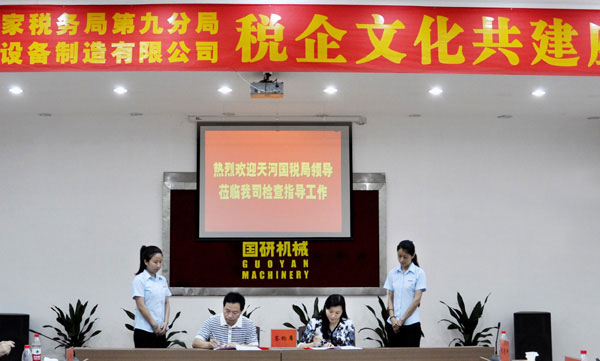 国研公司党支部是天河区“两新组织”党建工作示范点,也是天河区“先进基层党组织”,在观看完广州电视台《红棉璀璨》国研公司党建专题片后,天河国税局第九分局朱慧严局长发表了税企文化共建动员讲话,她说,税企文化共建就是为了构建和谐税企关系,不断提高企业依法诚信纳税和税务机关的服务意识,是以科学发展观和党的十八大精神为指导,以“共建和谐税收,服务科学发展”为宗旨,通过整合税企文化资源,形成良好的文化共建氛围,充分发挥优秀文化的凝聚、激励、规范、引导功能,促进税务机关和纳税人之间的有效沟通,达到税企共赢的目的。