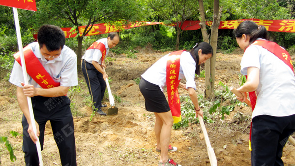 简单的启动仪式之后,大家高举党旗,直奔植树活动现场。各位党员、入党积极分子不顾炎热,二人或三人一组,互相配合协作,有的挥锹填土、有的扶苗加固、有的提水浇灌,现场一派热火朝天的景象。在大家的共同努力下,二百多棵树苗很快栽植完毕,原本毫无生机的荒地转眼已是绿意盎然。一场及时雨之后,小树苗更是棵棵充满生命的活力。