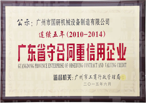 “连续五年(2010-2014)广东省守合同重信用企业”的牌匾在广州市世界杯网址入口_2026世界杯押注网址 设备制造有限公司的文化展示墙上格外引人注目,这是对公司多年坚持诚信经营的充分肯定,也是公司世界杯网址入口_2026世界杯押注网址“诚信、创新、分享、精进”的客观体现。